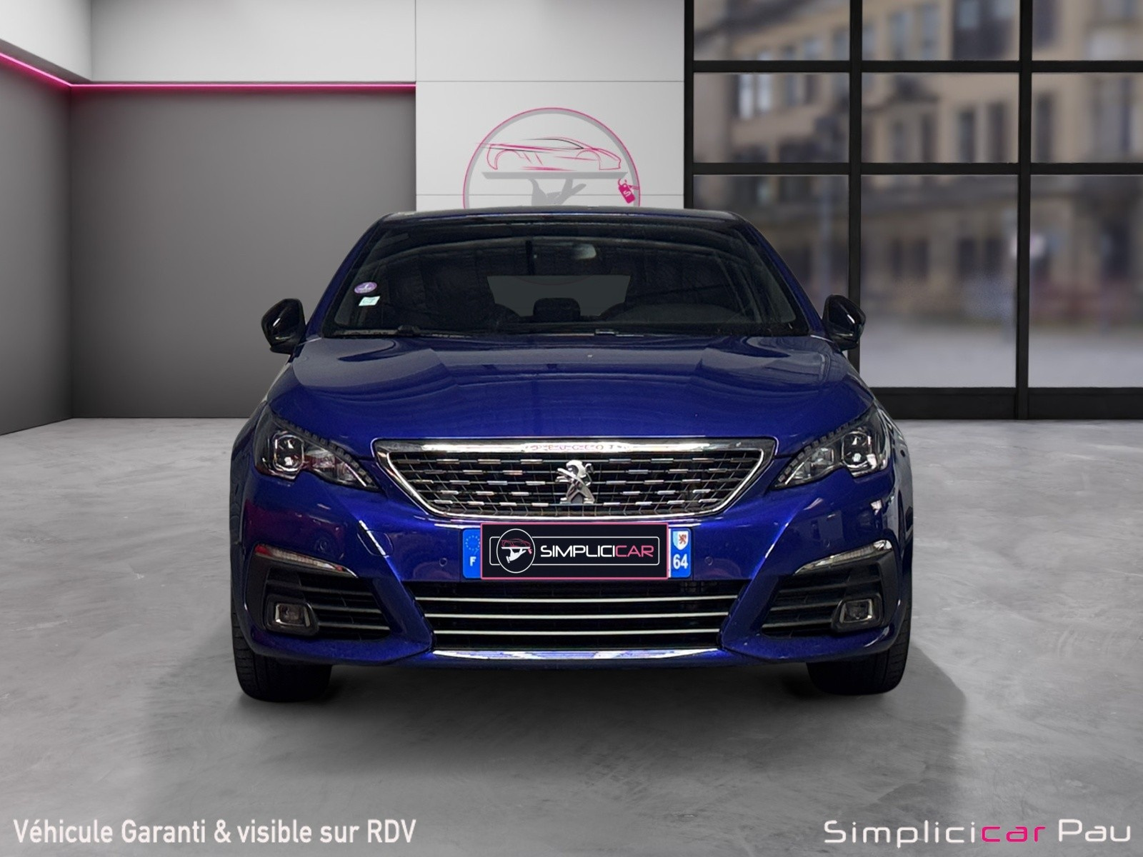 Calandre avec jonc périphérique et damiers chromés, intégrant le lion PEUGEOT