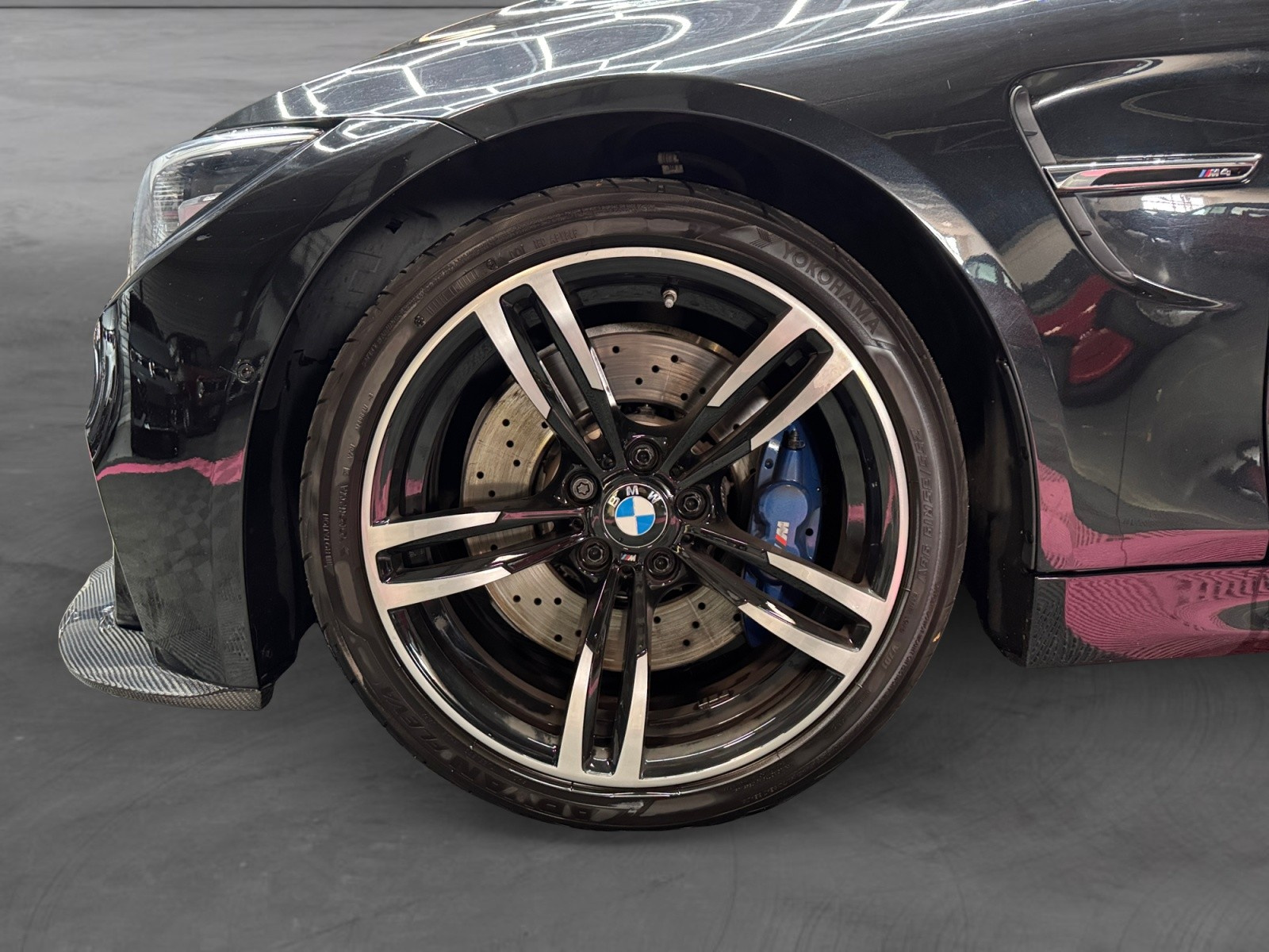 Système de freinage hautes performances avec disques de freins perforésà étrier fixe (4 pistons à l'AV, 2 pistons à l'AR), peints en bleu